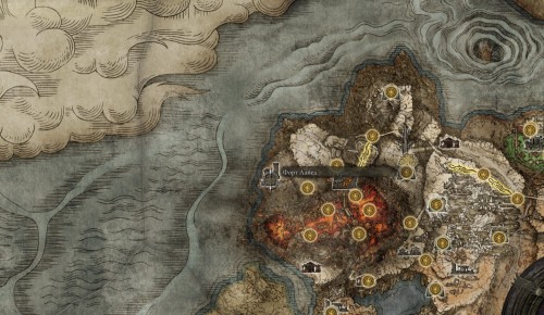 После возрождения возле «костра» двигайтесь на запад по направлению к форту Лайед. Потом идите на юг, дабы дойти до лавового озера. Там вы обнаружите Магмового змея. Разберитесь с ним, а потом поднимитесь на скалу слева (смотрите второе изображение ниже).