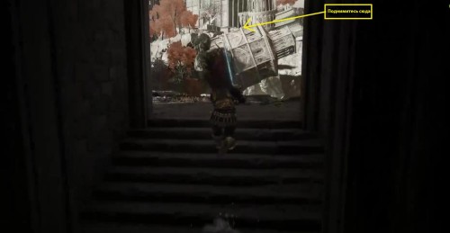 Воспользуйтесь лифтом, чтобы спуститься вниз. Выйдя из него, вы увидите полуразрушенное сооружение впереди. Именно на него вам и нужно взобраться. Для этого двигайтесь влево, а потом сверните направо и поднимитесь по лесенке. Опять поверните вправо, чтобы дойти до упавшего здания и перебраться по нему на другую сторону.