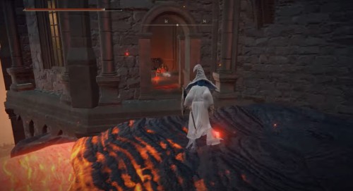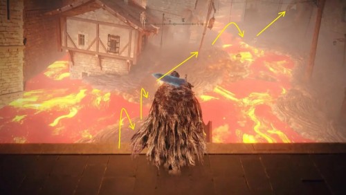 Пройдите через открытые двойные двери и выберитесь на улицу. Далее прыгните на застывшую магму, чтобы не попасть в лаву, и направляйтесь к лестнице справа. Эта лесенка позволит вам попасть в локацию с большим количеством клеток, подвешенных на столбах. Войдите в подъемник впереди, дабы подняться на нем наверх.