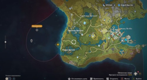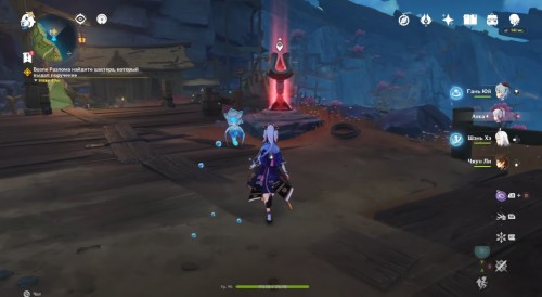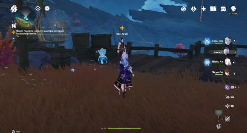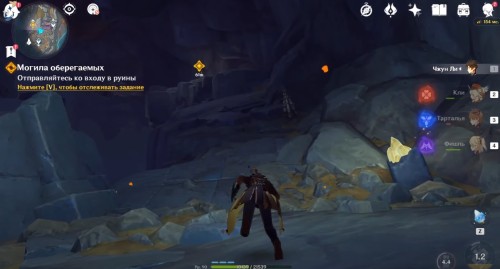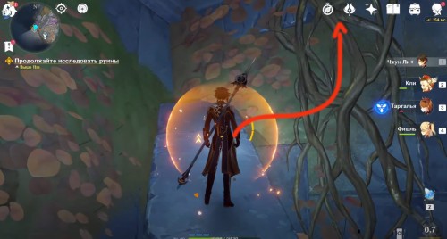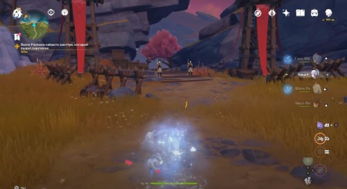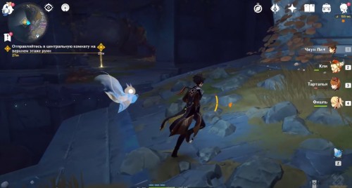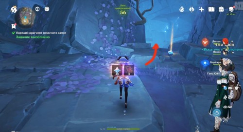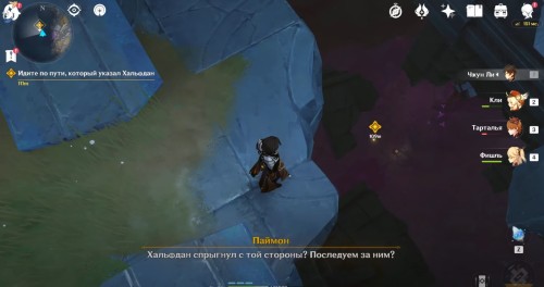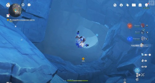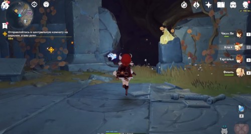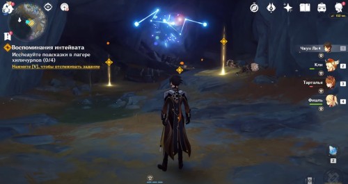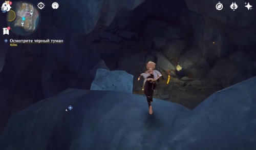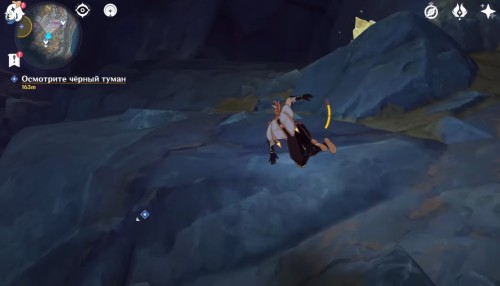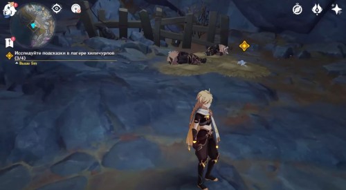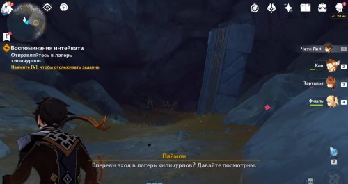 Следуйте за маркером. Для этого подойдите к отверстию чуть впереди и спрыгните вниз на самое дно. Добравшись до светящегося указателя, посмотрите небольшой ролик. Затем пройдите по дороге вперед и сверните влево. Далее вам нужно будет отправиться в лагерь хиличурлов, поднявшись по тропинке.