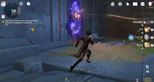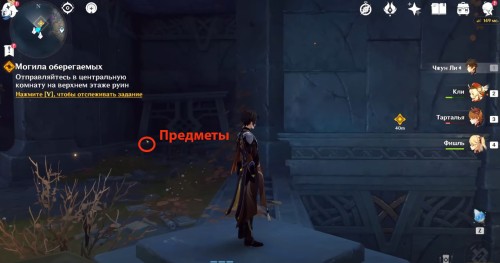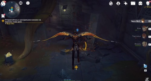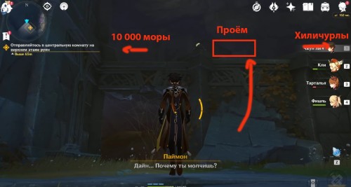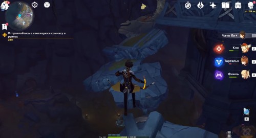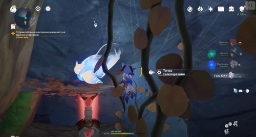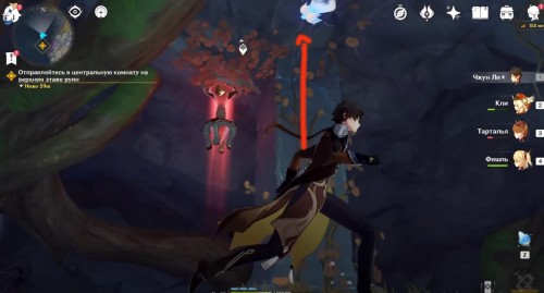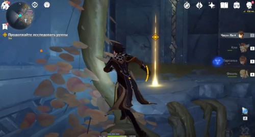 Поверните направо и перейдите на другую сторону, забравшись на колонну и спрыгнув на разрушенный мост. Войдя в новую комнату, поднимитесь по остаткам стены наверх. Слева можно найти 10 000 моры (осмотрите артефакт), а справа – хиличурлов. Пройдите в проем и спрыгните на огромный корень, чтобы пройти в следующую локацию.