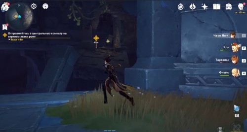 Разобравшись с противниками, подойдите к лежащим на земле хиличурлам и исследуйте данное место. Будет показан очередной ролик, в котором вы узнаете о старом соратнике Дайнслейфа.
