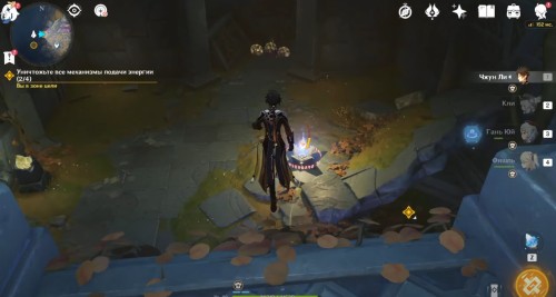 Для обнаружения устройств вам необходимо будет пройти к порталам, а потом спрыгнуть вниз. Возле первого механизма вы столкнетесь с Пиро и Электро магами бездны. Расправьтесь с врагами, используя Крио атаки. Разобравшись с ними, сломайте девайс обычными ударами.