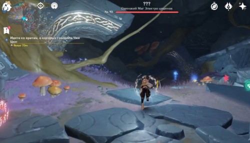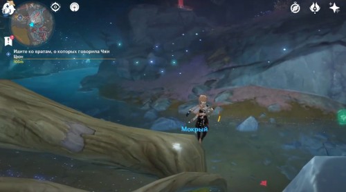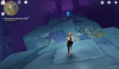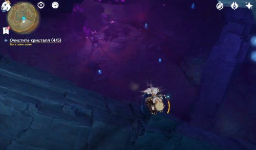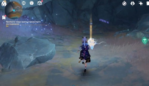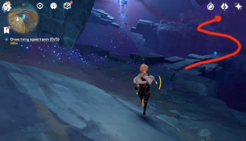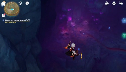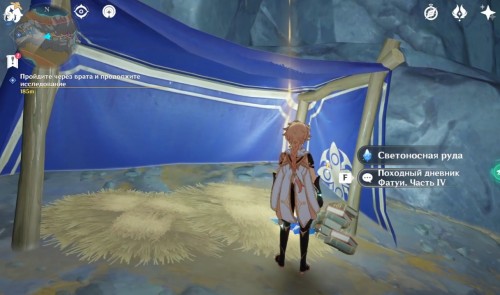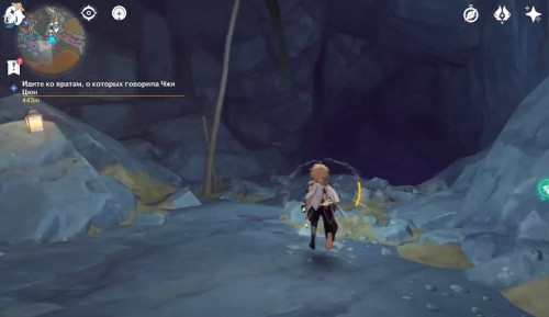 Пройдите через открывшийся проход и двигайтесь вглубь пещеры. По дороге вы найдете светоносную руду и дневник Фатуи. Двигайтесь дальше и разберитесь со слаймами. Вы окажитесь в просторной локации. Спланируйте вниз.