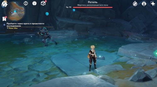 На земле вас будет ждать Гидро рыцарь Ретель. Разберитесь с ним, используя Крио и Пиро атаки. С него упадет жемчужина Бездны. Подбегите к фее и начните вести ее к маркеру. Продолжайте двигаться вперед, ведя духа.