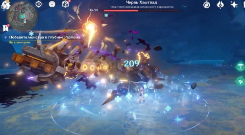 Когда у врага останется чуть меньше 10% здоровья, стартует новая кат-сцена. В ней вы снова увидите Е Лань, которая поможет вам, сбросив кристалл на монстра. Далее возвратитесь в лагерь отряда георазведки и поболтайте с Чжи Цюн. После беседы вернитесь на поверхность Разлома к Му Нину.