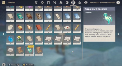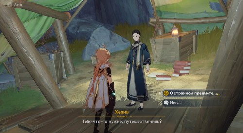 Начните рыбачить, выбрав удочку и наживку. Поймав первую рыбку, вы также получите Странный предмет. Вы сможете осмотреть его в инвентаре в разделе «Задание». Паймон при этом предложит показать его исследователю из Сумеру. Найти его можно в лагере отряда георазведки, расположенном возле Светящихся проходов. Ученого зовут Хедив.