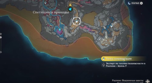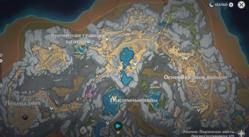 Итак, переместитесь к южному телепорту Основной зоны добычи. Весь маршрут показан на карте выше. Далее мы подробно рассмотрим весь путь. Развернитесь и пройдите в отверстие впереди. Войдя внутрь, пробегите немного вперед, а потом сверните вправо. Идите мимо лагеря фатуи, дойдите до обрыва и поверните направо. В результате вы окажитесь в Подземных водах.