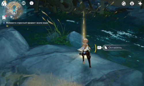 Примечание: Вы можете выбрать Анемо героя, встать возле воды и развеять Гидро элемент, чтобы он затронул странный предмет.
