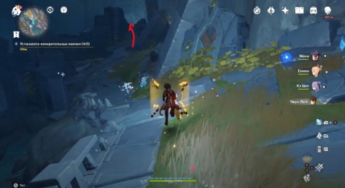Первый маячок нужно установить в самой юго-западной локации Разлома. Переместитесь к южному телепорту области, а затем сразу же спланируйте вниз в сторону указателя. Разместите устройство на каменном выступе.