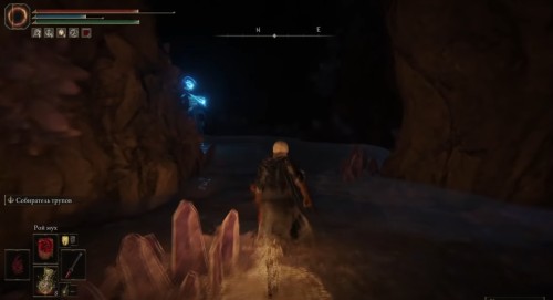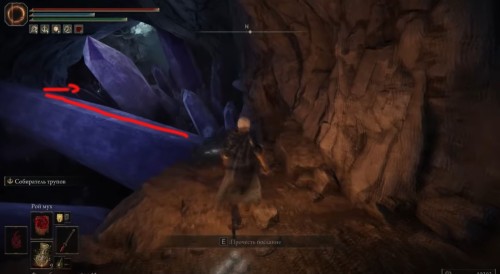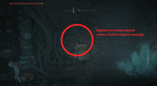 Добравшись до усыпальницы, пройдите за нее и ударьте по стене, чтобы открыть вход в скрытую пещеру. Войдите внутрь и через несколько шагов ударьте по еще одной иллюзорной стене. Двигайтесь вперед по туннелю и стукните по третьей стене. В итоге вы окажитесь в более-менее просторной локации с огромными кристаллами.