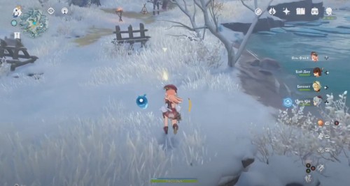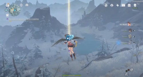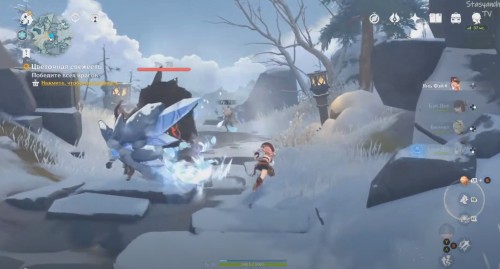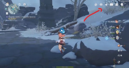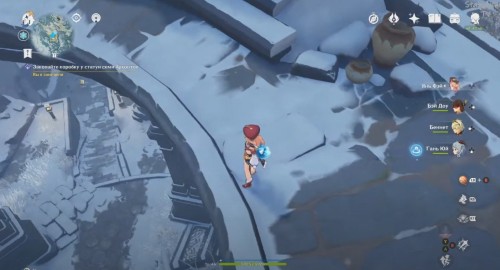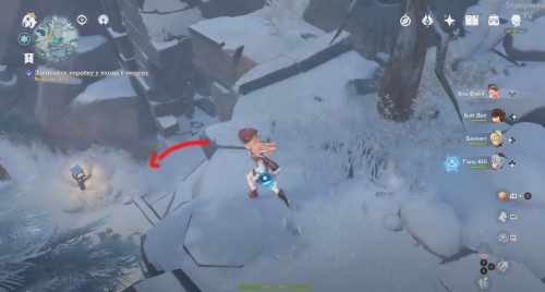 Телепортируйтесь к предыдущей точке быстрого перемещения, поверните направо и спрыгните с обрыва. Здесь на вас нападут хиличурлы и митачурл с ледяным щитом, поэтому будет полезно иметь в отряде одного или двух Пиро персонажей для уничтожения защиты врагов.
