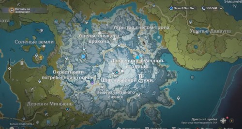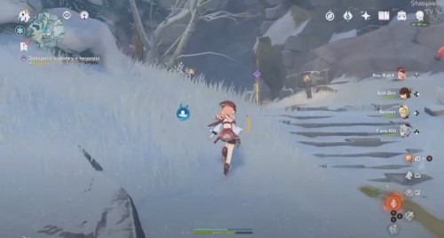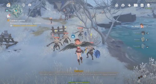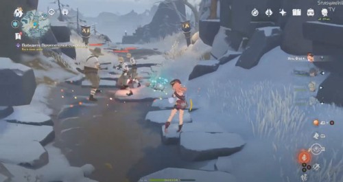 Теперь переместитесь к телепорту в Пещере звездного сияния, спрыгните с выступа и летите вперед к озеру. Уже издалека вы увидите светящийся указатель. Как только вы приблизитесь к нему, может появиться группа хиличурлов. Расправьтесь с монстрами. Советуем вам использовать Пиро атаки для уничтожения ледяных щитов.