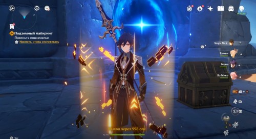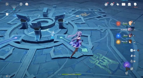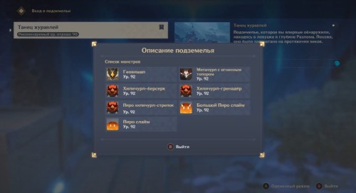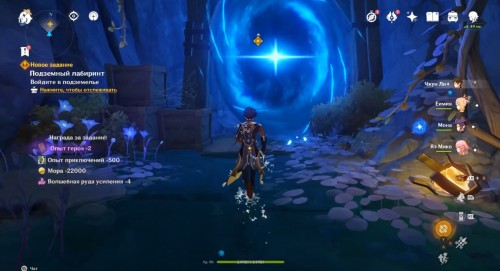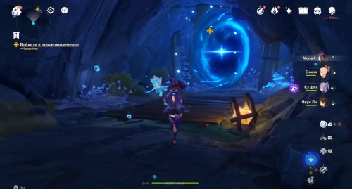 Вход в подземелье выглядит как синий портал. Взаимодействуйте с ним. Вы увидите информацию о данже. Игра порекомендует вам взять в отряд персонажей, относящих к стихии Гидро, так как вам придется столкнуться с большим количеством Пиро врагов. Впрочем, пройти эту область можно и без водных героев.