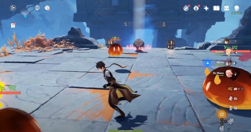 Спуститесь вниз и сразитесь с несколькими Пиро слаймами. Быстрее всего разобраться с ними можно с помощью Гидро, Крио или Электро атак. Расправившись с врагами, активируйте следующий куб, с которого пропадет красный барьер. Это перевернет островок впереди и создаст новую лесенку.