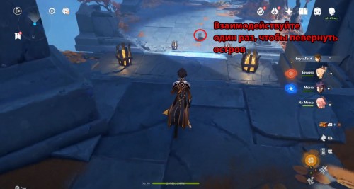 Вновь поднимитесь по ступенькам и сверните влево. Спуститесь вниз и поверните здешний куб, чтобы снова повернуть остров, который вы ранее посетили. На второй картинке ниже можно увидеть необходимый результат. Теперь поднимитесь на эту площадку и расправьтесь с группой хиличурлов и слаймов, чтобы разблокировать еще один куб.