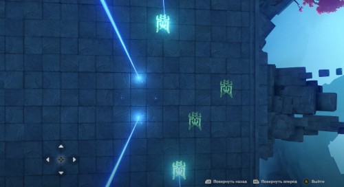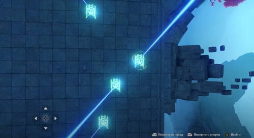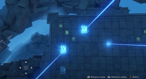 Теперь подойдите ко второму устройству и подвиньте два лазера так, чтобы они попали на два других фиолетовых знака (решение показано на скриншоте ниже). В результате вы активируете фиолетовую руну возле центрального механизма.