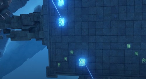 После этого уничтожьте трех детенышей геовишапов. Теперь снова взаимодействуйте с двумя столбами света, чтобы направить их лучи на крупные синие символы на противоположной площадке. В итоге вы активируете синюю руну на центральном механизме.