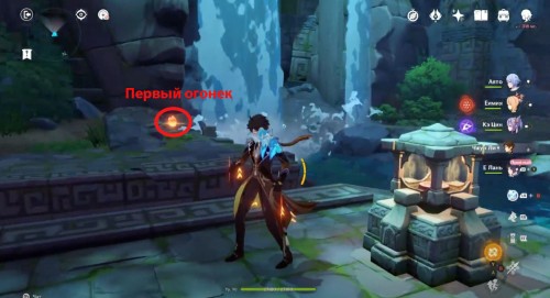 Расправьтесь с хиличурлами возле прохода и пройдите вперед. Справа вы увидите стену с оранжевым символом. Взаимодействуйте с ней, чтобы сдвинуть. За ней будет еще одна стенка со знаком. Ее тоже следует убрать. В результате вы увидите первый огонек. Возьмите его, но пока не относите к светильнику, так как можно сразу же подобрать второе пламя.