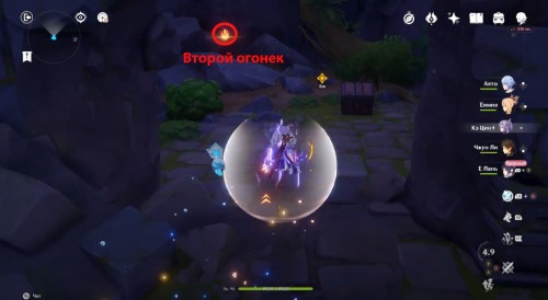 Для этого отодвиньте стену слева от первого огонька. Пробегите немного вперед и сдвиньте единственную стенку справа. Вы попадете в просторную область с группой хиличурлов и Пиро магом бездны. Расправьтесь с ними. Потом уберите стену справа от них. В результате вы найдете второй огонек.