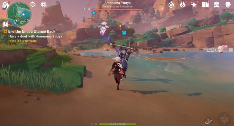 Источник энергии находится чуть дальше, в море. Воспользуйтесь ветряными кольцами, чтобы спуститься на небольшой островок внизу. Там на вас нападет Амэному Юя, находящийся под контролем Легендарного клинка Иссин. Разберитесь с атакующим. Теперь вы можете выбрать Кадзуху, даже если его не было в вашей команде.