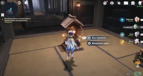 Возвратитесь назад к рычагу и выберите первую комнату (Двор). Войдите внутрь и подойдите к первому мелодичному омамори. Прислушайтесь к нему. Затем подберите листок, поднимитесь по лестнице и приблизьтесь к первому святилищу.