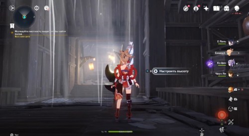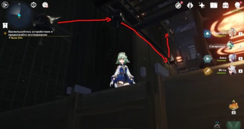 После просмотра ролика пройдите в коридор. Здесь вы обнаружите заблокированный рычаг, мелодичный омамори и святилище. Подберите парящую табличку и поместите в святыню для создания воздушного потока. Прыгните в него, чтобы взмыть ввысь.