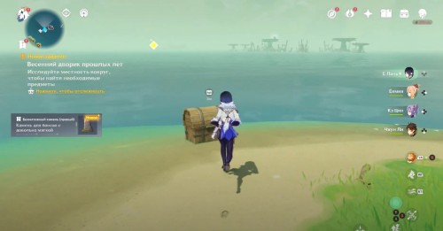 После беседы с Кадзухой и попадания в новую локацию, вы получите левую и правую части Безмятежного камня. Впереди можно обнаружить обычный сундук, если вы еще не открыли его ранее. Далее вам нужно будет отправиться на Остров пудинга, вслед за маркером. Можете просто телепортироваться туда, если у вас открыта точка быстрого перемещения.