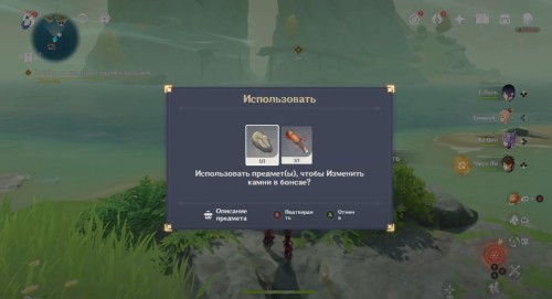 Вы вернетесь в реальный мир и получите Светящийся камень. Переместитесь на Остров пудинга и спланируйте вниз к зоне поисков. Там вы обнаружите митачурлов, Электро мага бездны и слаймов. Разберитесь со всеми врагами и откройте богатый сундук, в котором лежит Камень рокария (правый) и инструмент.