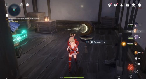 Пройдите в новый коридор. В конце вы увидите еще один рычаг и запертую дверь. Взаимодействуйте с рукояткой, чтобы повернуть комнату. Далее подберите мелодичный омаори, который ранее висел возле потолка. Снова поверните комнату и вставьте табличку в одно из святилищ по бокам.