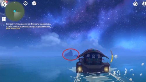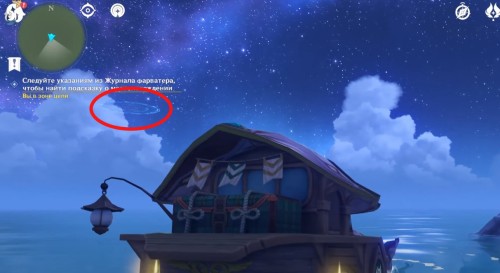 При необходимости прокрутите игровое время на ночь (23:00-02:00) с помощью меню Паймон. Затем посмотрите на ночное небо, на котором вы должны будете увидеть большую синюю печать. Направляйтесь в ее сторону, плывя в юго-восточном направлении от рифа.