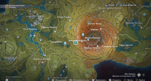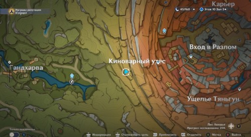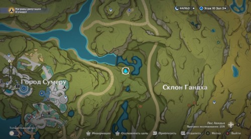 Переместитесь к телепорту на Склоне Гандха, а потом летите на запад. Нужное место расположено к востоку от города Сумеру. Попав в точку, показанную на скриншотах ниже, вы увидите в водоеме внизу необходимую вам рептилию. Вокруг нее будут бегать другие крокодилы меньших размеров.