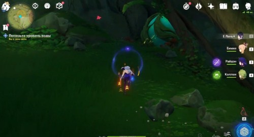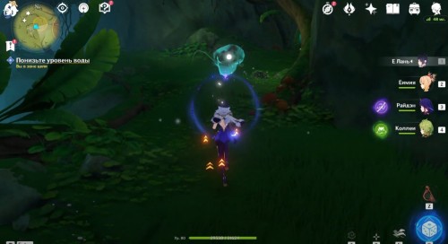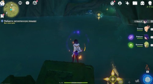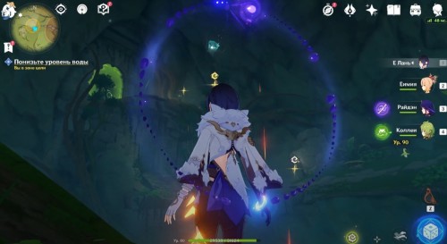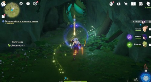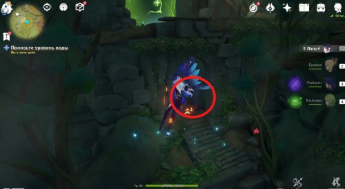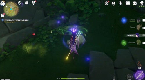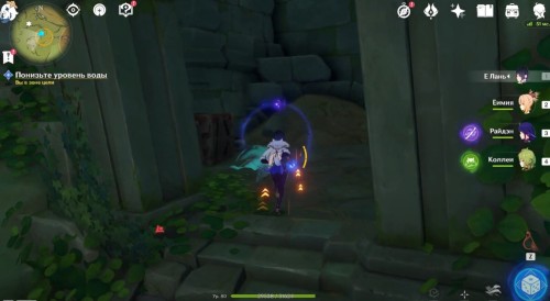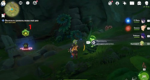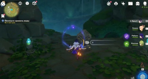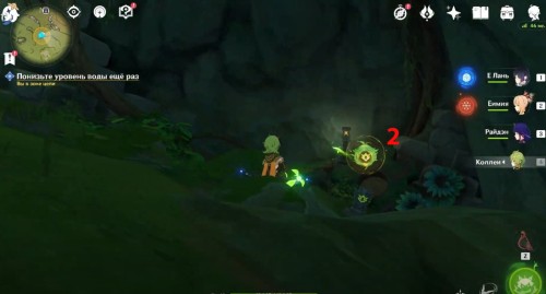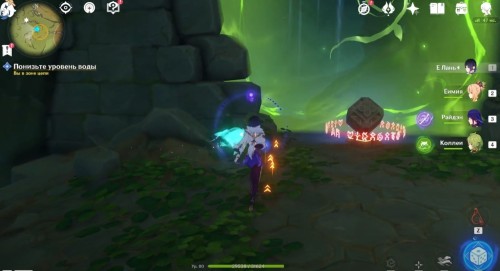 Как только барьеры с тотемов спадут, вы сможете активировать их (сделать это нужно быстро), используя дендрогранумы или Дендро атаки. Включить их можно в той же последовательности, что и мишени, поэтому ориентируйтесь на верхние скриншоты. Если вы все сделали правильно, то появится роскошный сундук, а на выступе слева разблокируется механизм. Взаимодействуйте с кубом, чтобы слить всю воду в пещере.