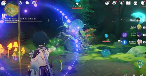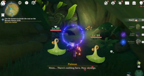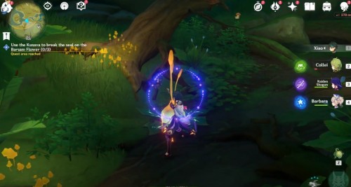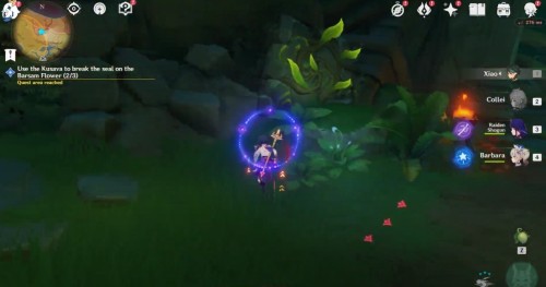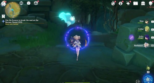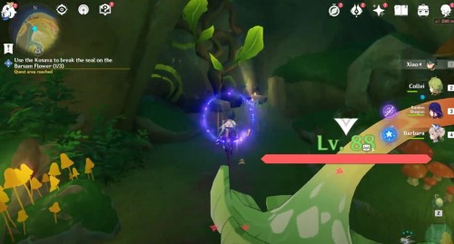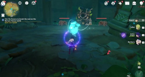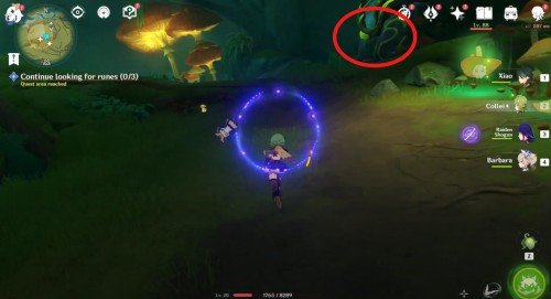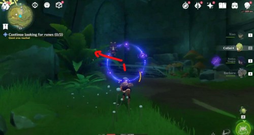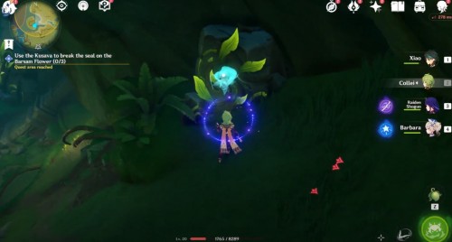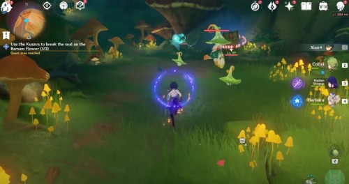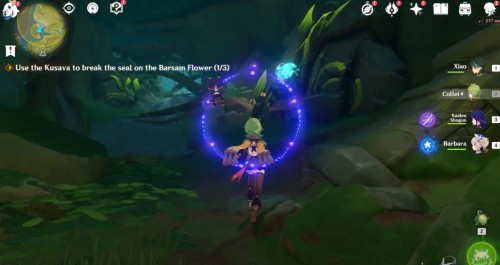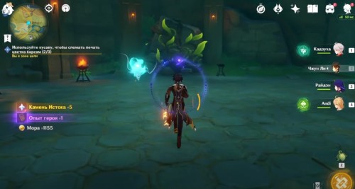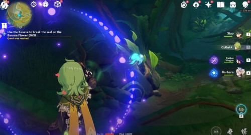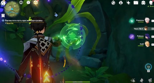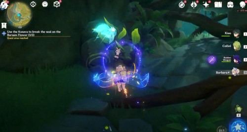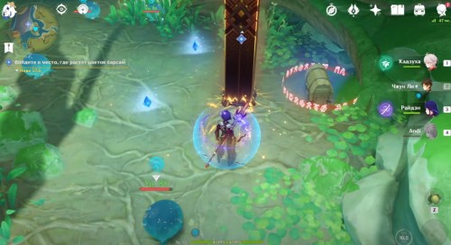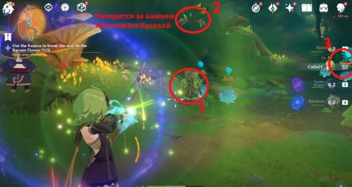 Выстрелите Кусавой в следующий камень, возле которого остановился дух. За ним будет лишь гриб, выпускающий взрывоопасные споры. В конце разрушьте еще один булыжник, найдя Дендро тотем. Активируйте его для создания нового прохода. Теперь просто отведите фею к «домику» возле зеленого барьера.