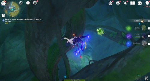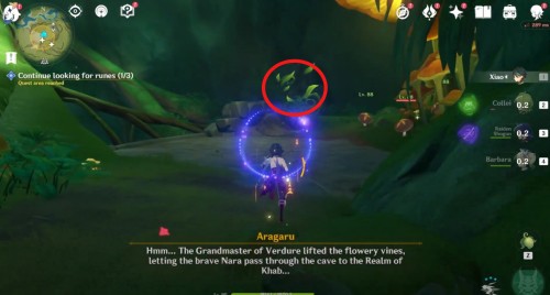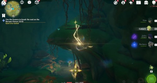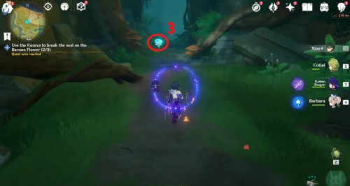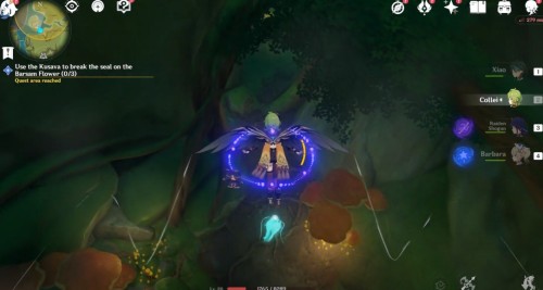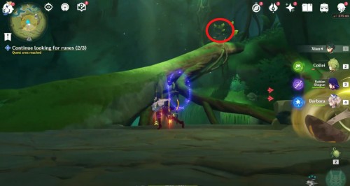 Подбегите к правой фее (на картинке выше отмечена цифрой «1») – она залетит в правую пещеру. Бегите за ней через дупло дерева. Когда она улетит вверх, ударьте по бутону соцветия Дендро атакой, чтобы создать четырехлистные символы. Воспользуйтесь ими и доберитесь до выступа наверху. Затем спуститесь за духом вниз.