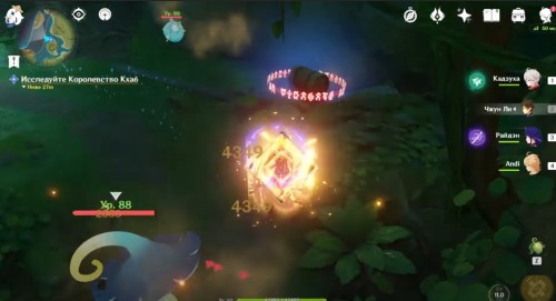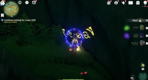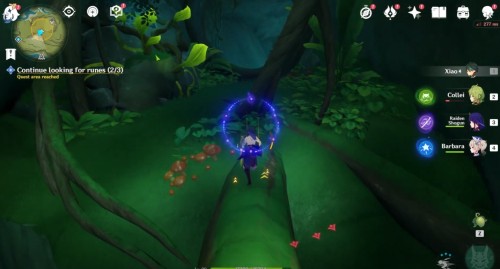 Подойдите к левой фее (была отмечена на картинке цифрой «2») и пройдите за ней в пещеру. Вы увидите впереди плесенников и Дендро монументы – они не связаны с этим квестом, однако их активация позволит открыть обычный сундук. Их можно атаковать Дендро способностями в любой последовательности, однако мы все же советуем вам тот порядок, который указан на скриншоте ниже.