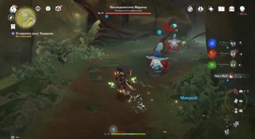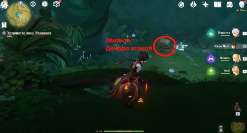 Затем пройдите направо и спуститесь вниз. Расправьтесь со всеми противниками, чтобы они вам не мешали. Возьмите Дендро персонажа (подойдет и Путешественник) и ударьте по ветви с камнем Дендро стихией, чтобы поднять булыжник и взять дендрогранумы. Теперь быстренько возвратитесь в предыдущую локацию с опухолью Увядания.