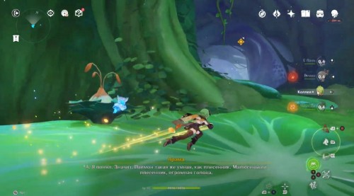 Ударьте Дендро атакой по бутону соцветия для вызова четырехлистных символов и перелетите к барьеру. Разберитесь с плесенниками чуть дальше и соберите дендрогранумы. После этого выстрелите в зеленые мишени для снятия купола и заберите второй первобытный янтарь.