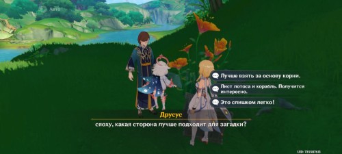 Для начала игроки должны поговорить с сумерским ученым. Друсус делает подсказки для своей новой загадки. Ученый попросит путешественников помочь в этом нелегком деле. От игроков потребуется только выбрать вариант ответа во время разговоров с умным авантюристом.