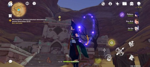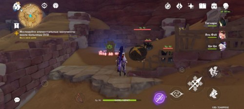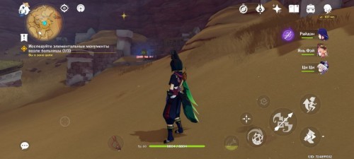 Стоя спиной ко входу, идите вперед и налево. Здесь, наполовину погруженный в песок, стоит первый Дендро тотем. Активируйте его Дендро атакой.