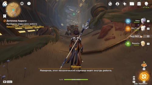 Когда вы разобьете очередную зеленую печать и пройдете внутрь механического коридора, Паймон скажет, что окружающее вас пространство похоже на руку робота, и что нужно продолжать идти.