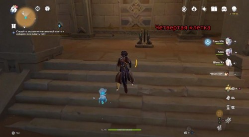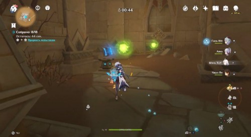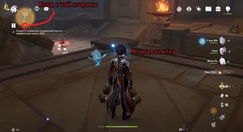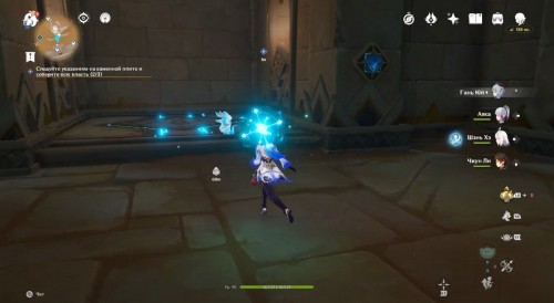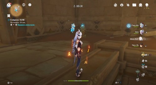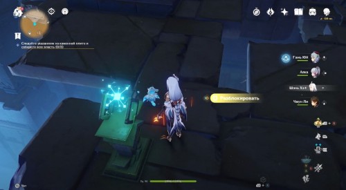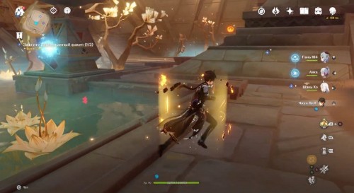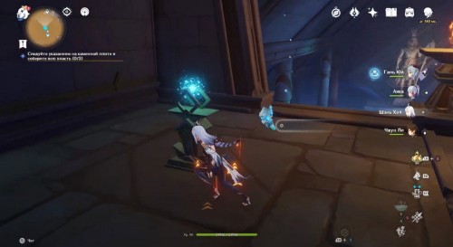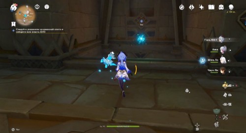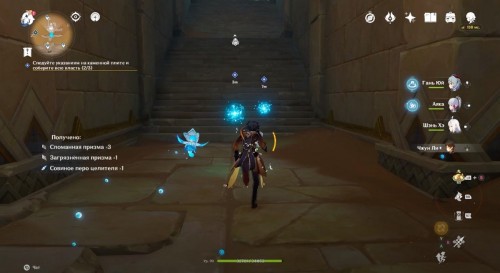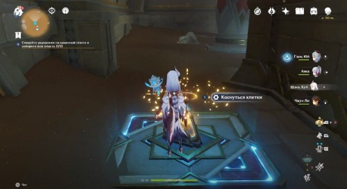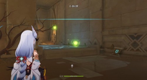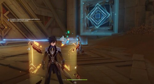 Здесь вы также можете начать испытание по сбору 18 Дендро частиц (необязательно для квеста), чтобы получить в награду обычный сундук. Возвратитесь наверх к факелам и теперь пройдите направо. Уберите барьер, взаимодействовав с консолью рядом. Поднимитесь по лесенке наверх, пройдите по коридору и проведите разблокировку первозданной искры, находящейся в левом ближнем уголке помещения.