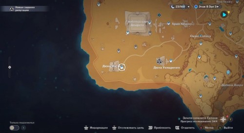Примените Плиту красных песков, выберите Место перерождения из списка и нажмите на надпись «Перейти», дабы на карте появилась соответствующая метка. Нужное место находится к северу от дюны Магмы – телепортируйтесь туда.