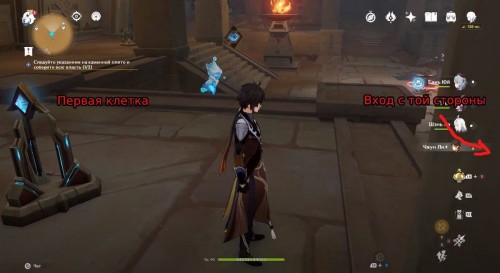 Постараемся описать необходимые действия по шагам. Сначала вам нужно будет переместить клетку слева от входа. После этого сразу же бегите в дальний правый угол ко второй клетке (рядом с булыжником) и передвиньте ее.