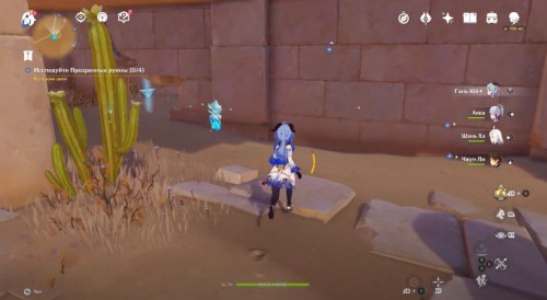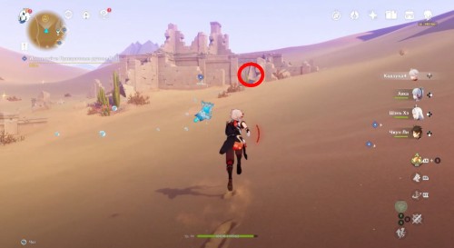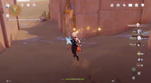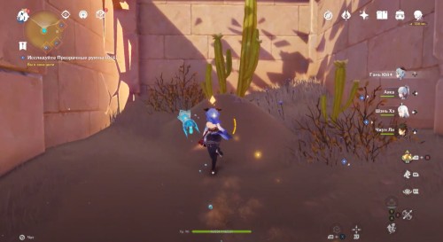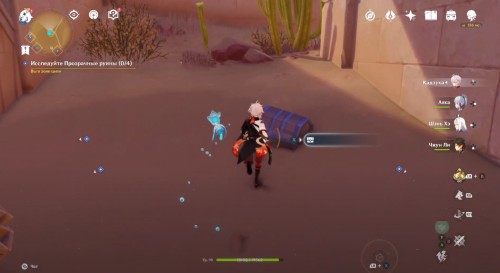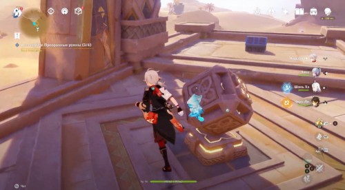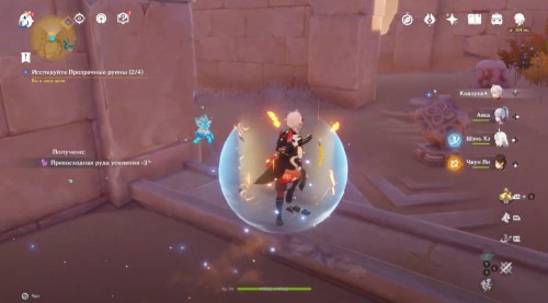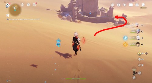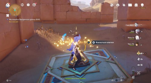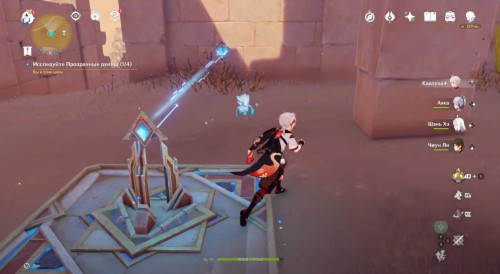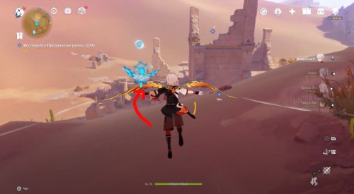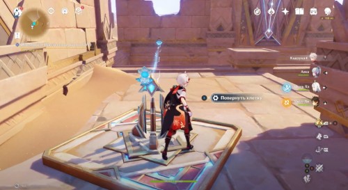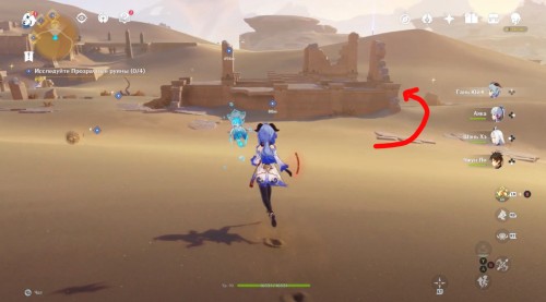 Пройдите налево и сразу еще раз поверните влево. Здесь вы увидите кучу песка, которую нужно развеять Анемо атакой. В результате вы раскроете куб-консоль. Нажмите на него для открытия двери с другой стороны. Пройдите в секретную комнату и осмотрите богатый сундук, чтобы завершить исследование руин.