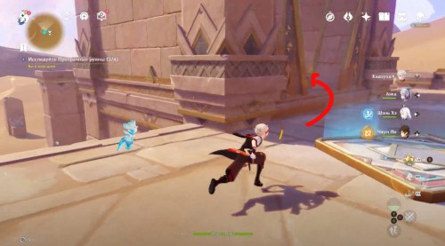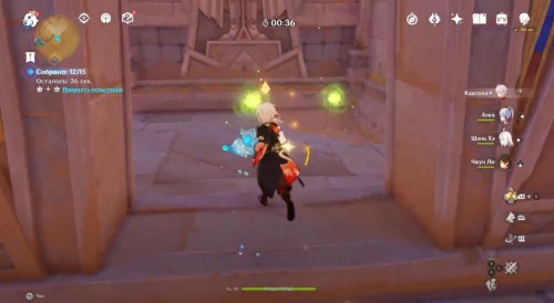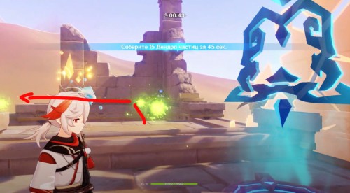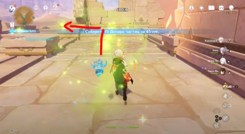 Поднявшись, можете начать испытание, в котором вам нужно будет собрать 15 Дендро частиц за 45 секунд (необязательное действие). Затем сверните влево, пробегите вперед и снова поверните налево. Войдите в постройку и спрыгните в дыру. Разберитесь с роботом и пройдите налево.