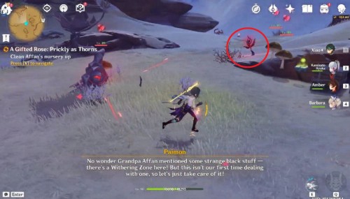 По прибытии вы обнаружите, что место питомника заняла зона Увядания. Расправьтесь с плесенниками и, используя дендрогранумы, уничтожьте цветки и опухоль Увядания. За это вы получите обычный сундук.