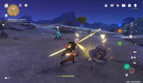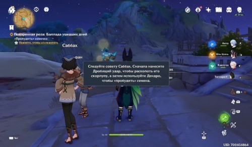 По подсказке Саббах сначала используйте Дробящий удар – то есть обычную атаку – чтобы сломать камень. Рекомендуем взять в команду двуручника, чтобы камень рушился быстрее. После этого атакуйте открывшиеся ямки с семенами элементом Дендро. Спустя некоторое время из семян прорастут первые побеги.