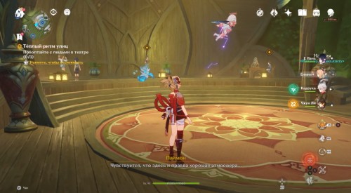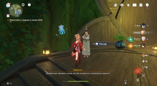 Мероприятие стартует через 2 игровых дня и пройдет после обеда (с 15:00 до 18:00). Вы можете пока заняться другими делами или попросту прокрутить время с помощью меню Паймон. После этого направляйтесь в театр.