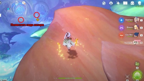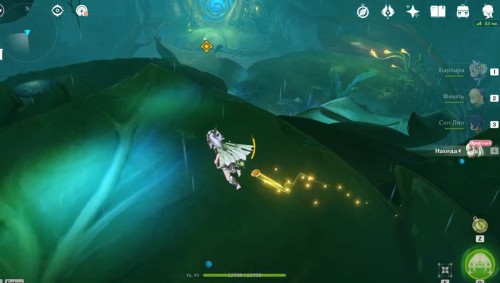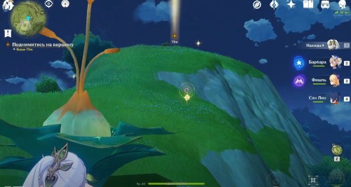 Далее вам нужно будет подняться на вершину горы, отмеченную указателем, – просто бегите наверх, продолжая по возможности использовать четырехлистники (их можно вызвать, ударив Дендро атакой по бутону соцветия).
